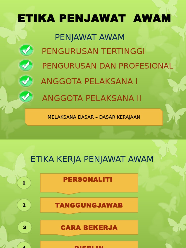 PAKAIAN YANG TIDAK DIBENARKAN BAGI PENJAWAT AWAM WANITA. Pekeliling Etika Berpakaian Penjawat Awam Baju Melayu Office Rules Baju Kurung Jumaat 16 April 2021. CIRI PENJAWAT AWAM YANG BERKUALITI KEUNGGULAN PERIBADI KOMPETENSI PROFESIONALISMA USAHA-USAHA KE ARAH PENERAPAN NILAI DAN ETIKA Langkah-langkah penerapan nilai dan etika yang telah diambil oleh kerajaan adalah.